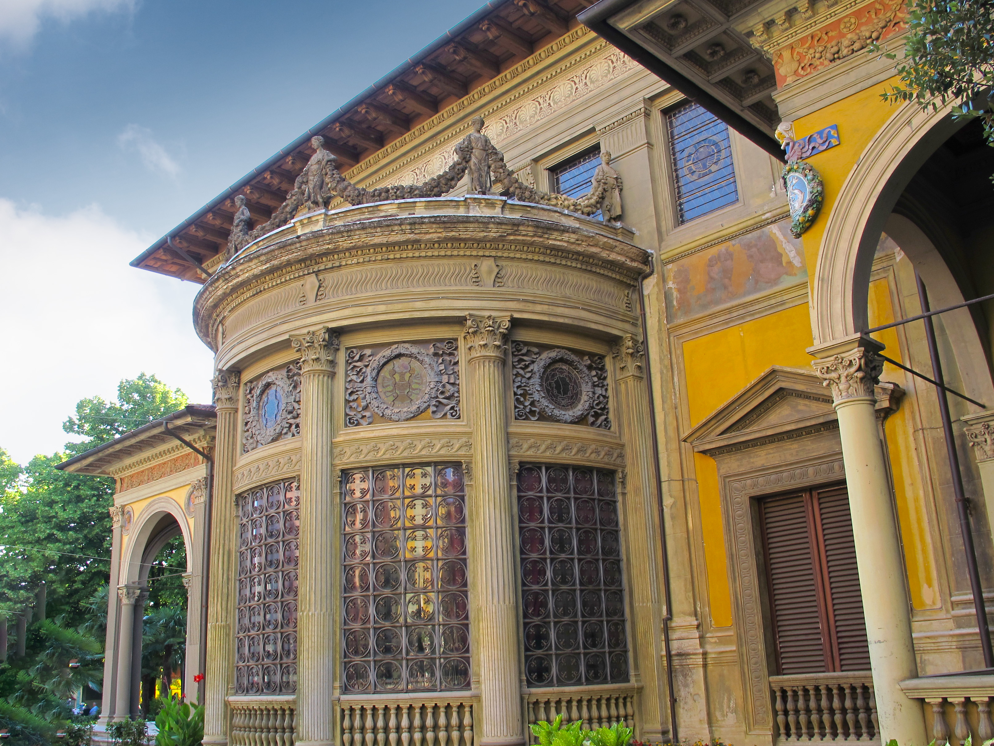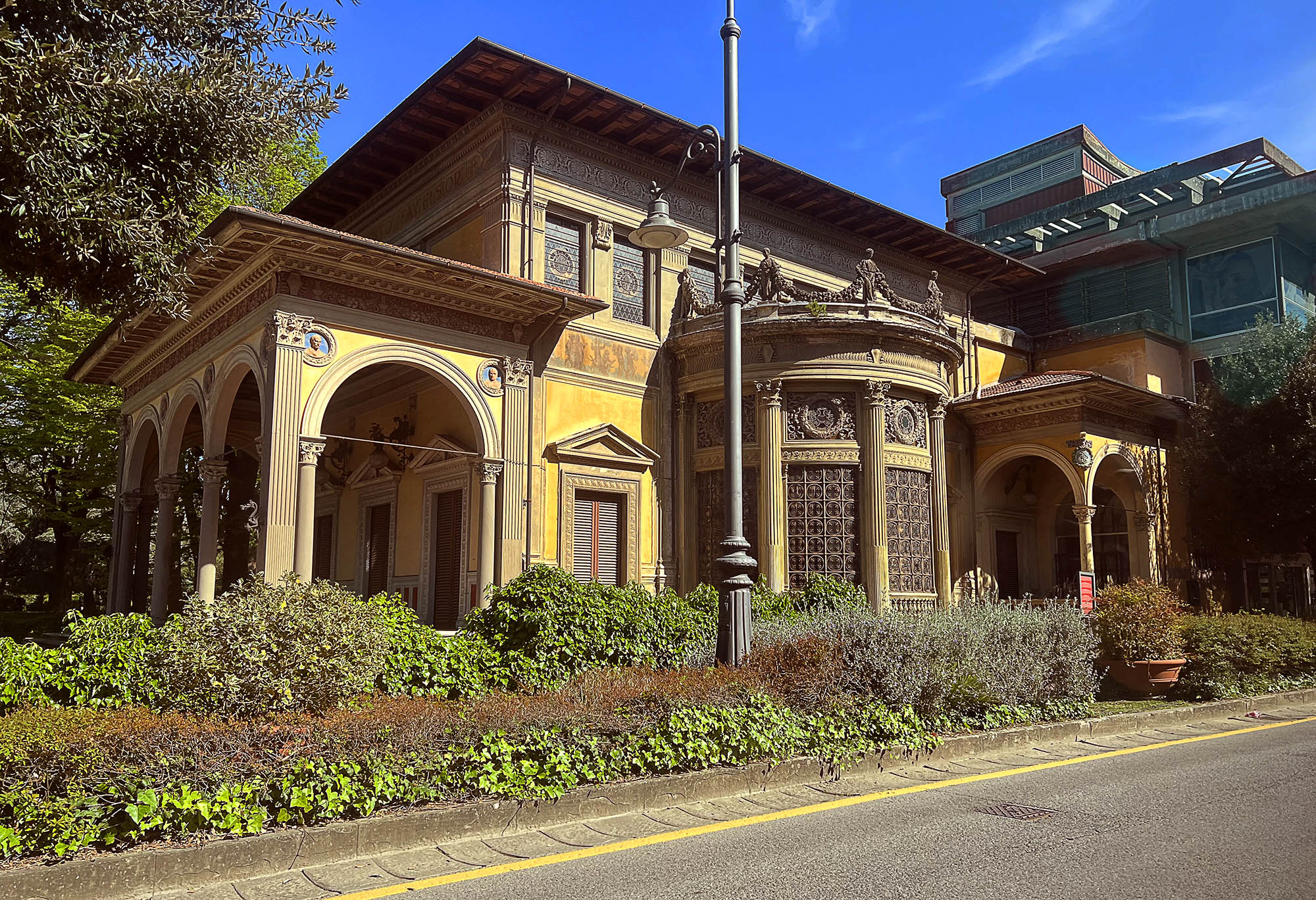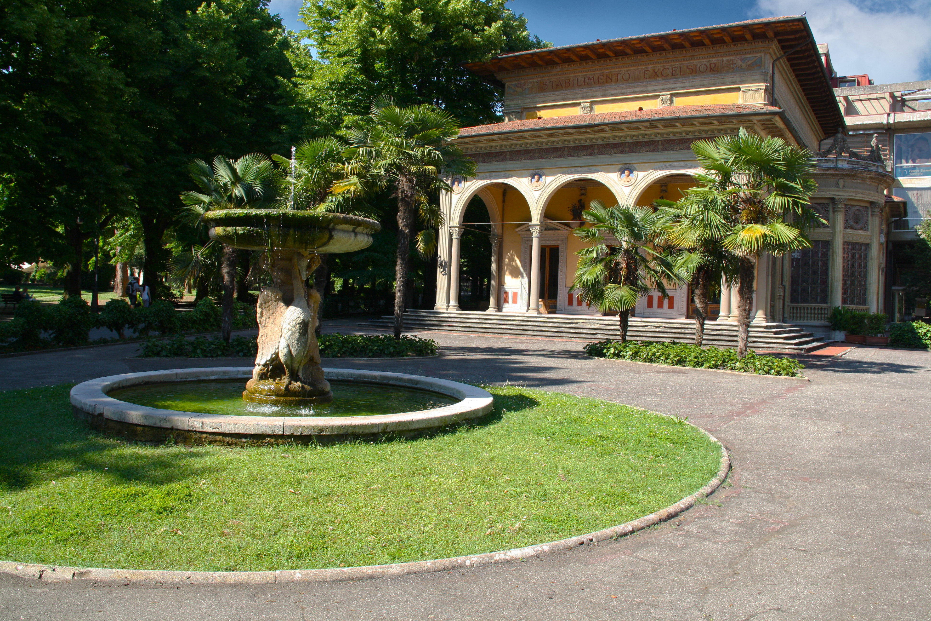 On the opposite side of Viale Verdi, the Tamerici Pavilion is still recognizable in its characteristic architectural structure, designed in 1903 by Giulio Bernardini as a kiosk for the sale of salts extracted from the Tamerici spring waters. On the left side, the shop of the "Arte della Ceramica" manufacturing, founded in Florence in 1896 by Galileo Chini, was housed in the building. The pavilion is decorated at the top with cherubs and floral interweavings, probably the work of the almost unreadable Chini, and on the façade by the four bas-reliefs in modeled grès by Domenico Trentacoste for the Chini Manufacturing stand set up on the occasion of the International Exhibition of Decorative Arts in Turin in 1902. Among the figures represented in the panels, inspired by ceramic processing, the same Galileo Chini is recognizable, who thoughtfully listens to the voices of three Muses. In front, the Excelsior Plant is introduced by an elegant triangular garden, which houses the "Fountain of Swans" by the sculptor Pirro Bianchi and on which the Renaissance-style loggia overlooks.