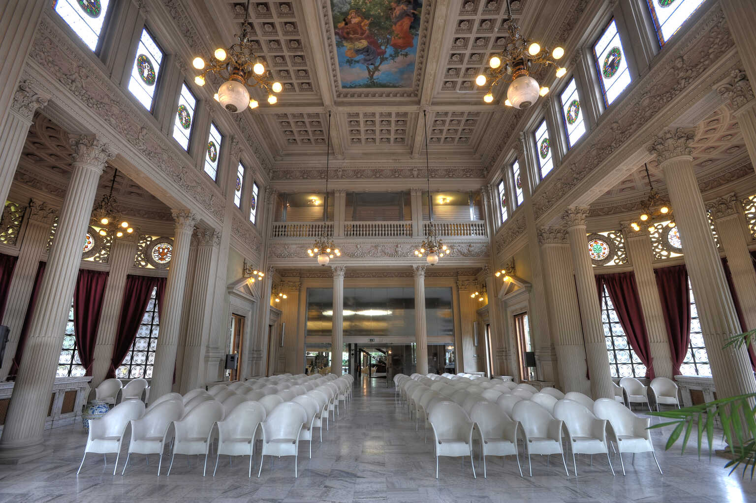 The "liberty hall", skillfully connected to the modern part, is mainly used for conferences, exhibitions, and concerts. The two lateral exedrae, closed by artistic stained-glass windows interspersed with Corinthian columns, still house the old dispensing benches, currently carried out in the main hall. The tempera mural on the ceiling is the work of Ernesto Bellandi. In the sixteen windows that define the upper perimeter of the hall, the coats of arms of ancient Tuscan municipalities are represented with colored glass; below runs a delicate stucco frieze with putti and festoons bas-reliefs. Along the elegant external loggia, eight enameled terracotta medallions are inserted, depicting illustrious figures from the history of Montecatini. A little further on, there are the eighteenth-century Leopoldine Baths, almost completely transformed by the intervention of Ugo Giovannozzi between 1922 and 1926 and currently under renovation.