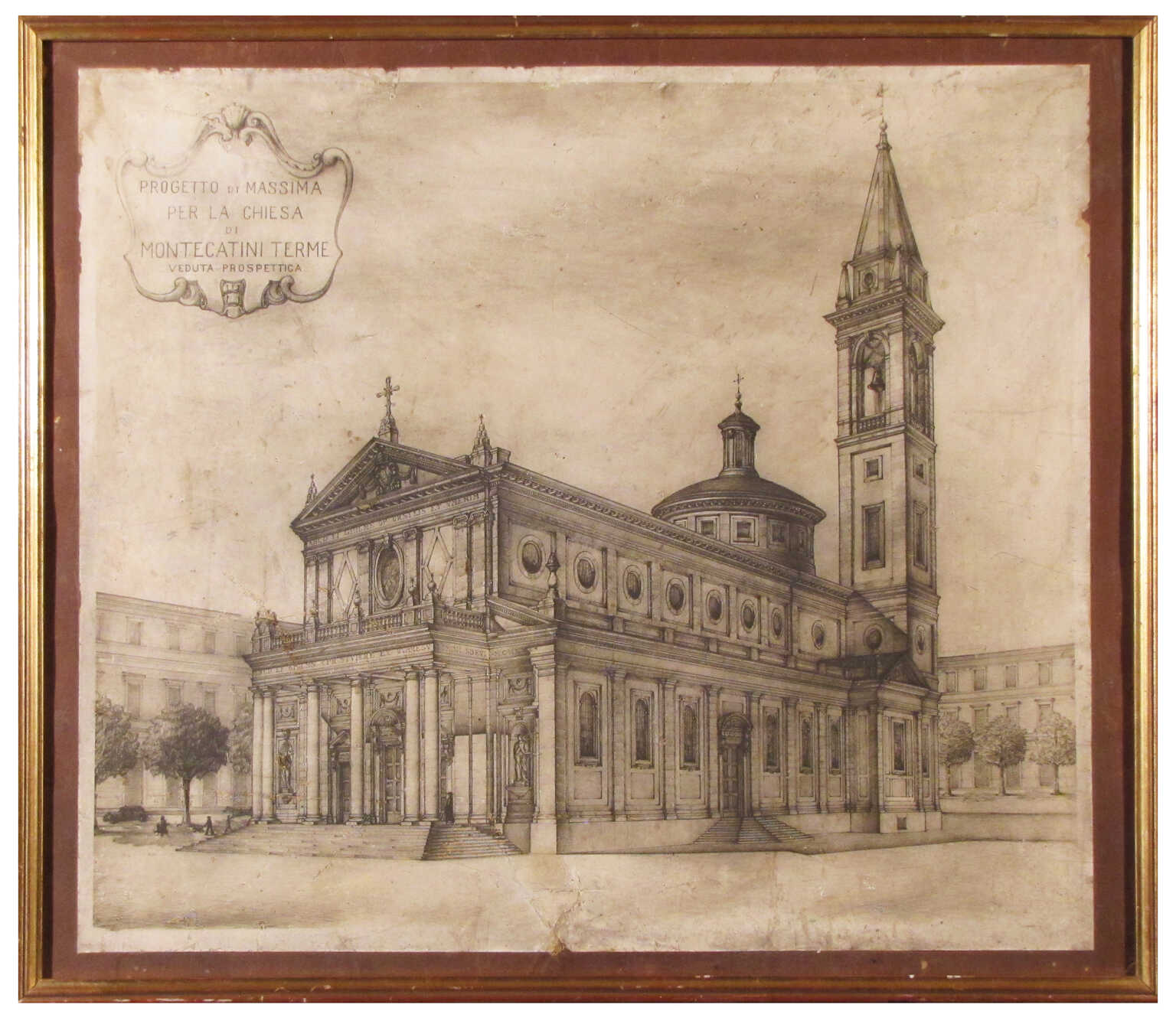 Per quanto concerne la chiesa, l’ingegnere fiorentino iniziò a lavorare al progetto dopo il 1951 a seguito della richiesta dei Montecatinesi di “dare al nuovo tempio un aspetto architettonico notevole pur monumentale entro linee semplici che si armonizzino con quelle attuali del pronao che deve essere conservato”.