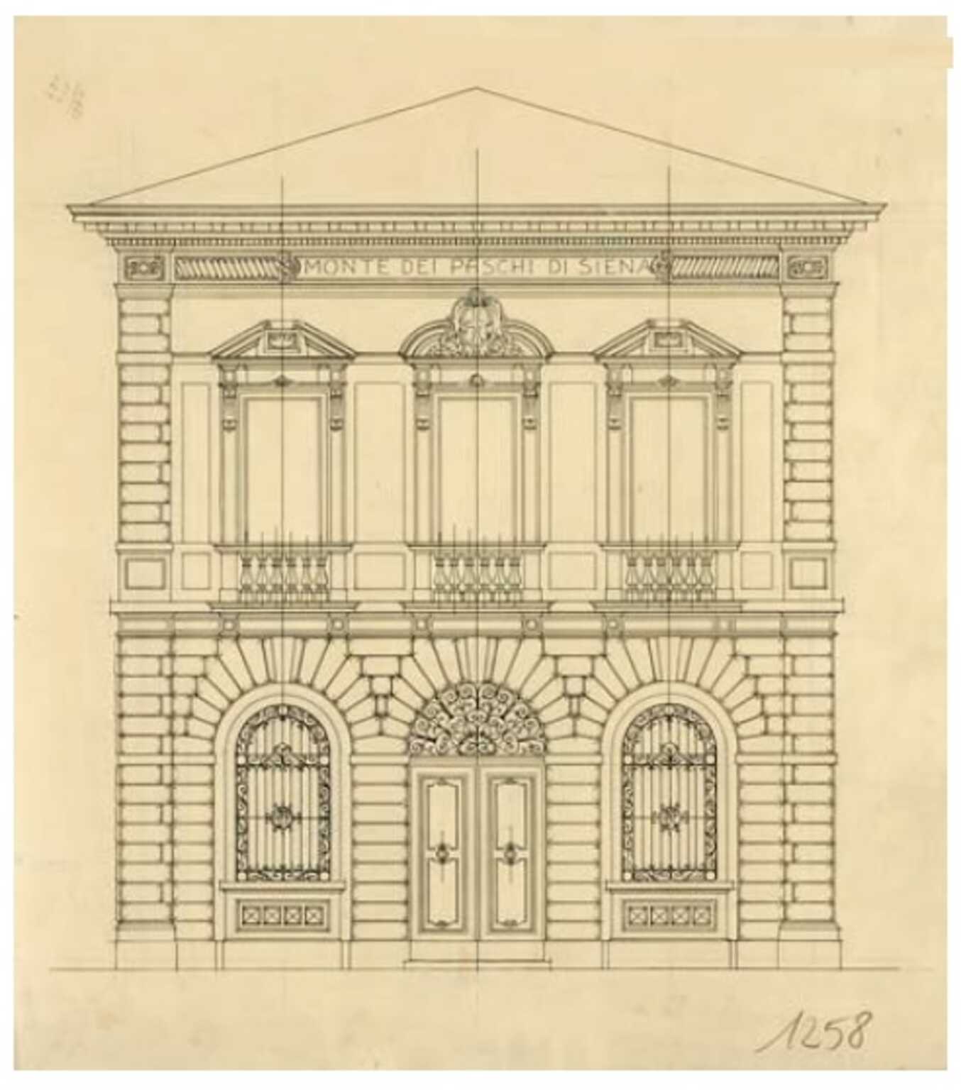 Il progetto dell’Istituto di Credito senese è del 1930. Esso prevedeva la realizzazione di una elegante palazzina caratterizzata, a piano terra, da un portone d’ingresso centrale e due finestre laterali. Un elegante cornice divideva il piano inferiore da quello superiore dove, in corrispondenza delle sottostanti aperture, la facciata ospitava tre finestroni incorniciati da colonne. Sulla cornice si legge il nome della più longeva banca in attività.