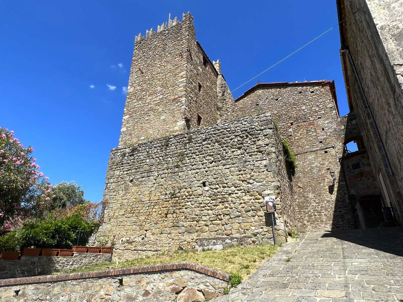 basse del comune, oltre che con la strada, anche con la graziosa funicolare. Del grande castello, raso completamente al suolo nel XVI secolo, restano alcune porte medievali e poche torri. Ai tempi del loro splendore erano lunghe due chilometri.