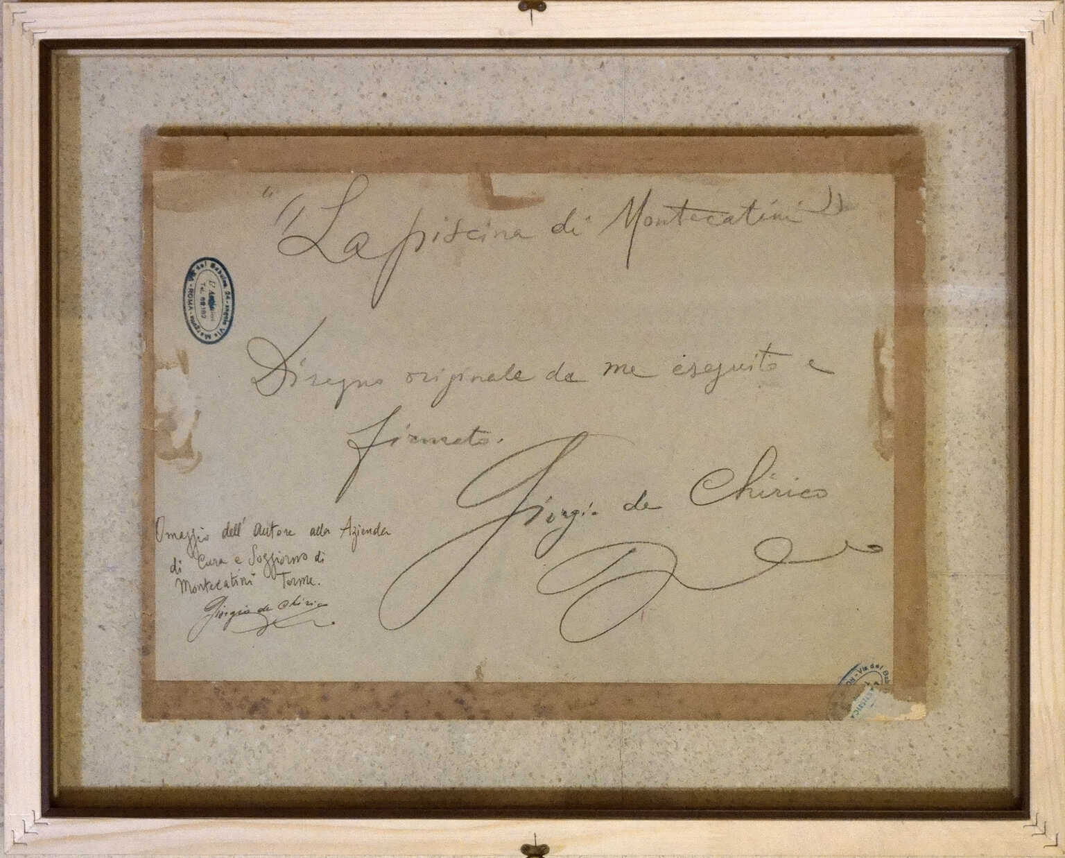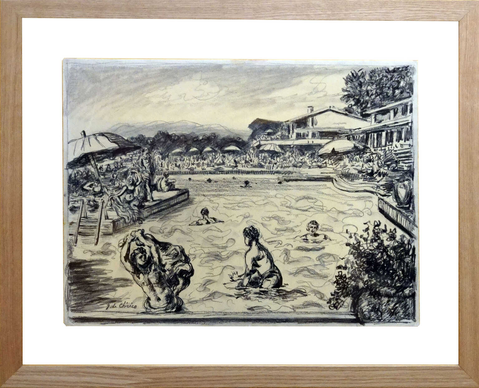 Ma il complesso realizzato dai due professionisti è ancora visibile in un disegno di Giorgio De Chirico, La piscina di Montecatini, 1960 ca., lapis e china su cartoncino, cm 29,5x39,5 (Collezione Provincia di Pistoia) ospite abituale di Montecatini anche per l’amicizia che lo legava a Luigi Russo titolare della famosa galleria d’arte Barcaccia che si trovava in Viale IV Novembre.
