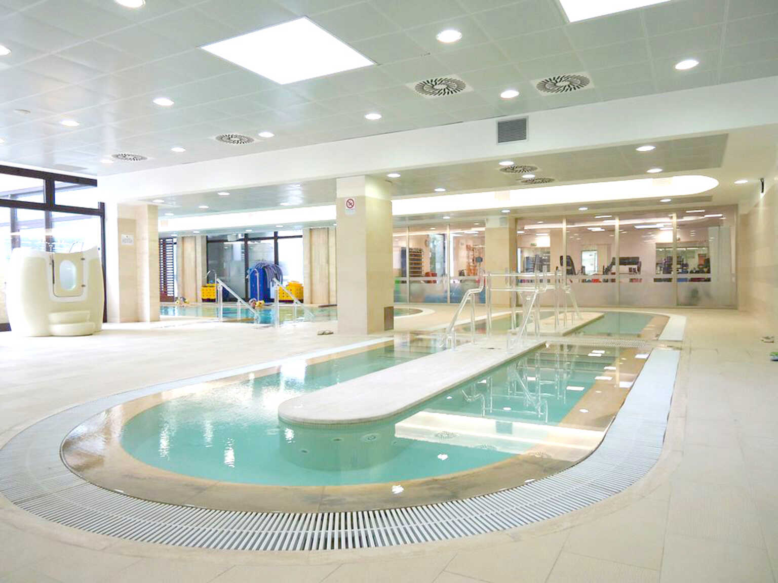 Il reparto di fangobalneoterapia offre 66 camerini singoli, 28 doppi per balneazione e massaggi e 8 ambulatori medici, mentre il percorso ipogeo ospita il reparto di riabilitazione fisioterapica con piscine termali, itinerari riabilitativi, percorso vascolare e due palestre. Oltre alle tipiche cure termali, offre anche programmi personalizzati per atleti e sportivi, corsi di yoga, trattamenti olistici e cure ayurvediche.