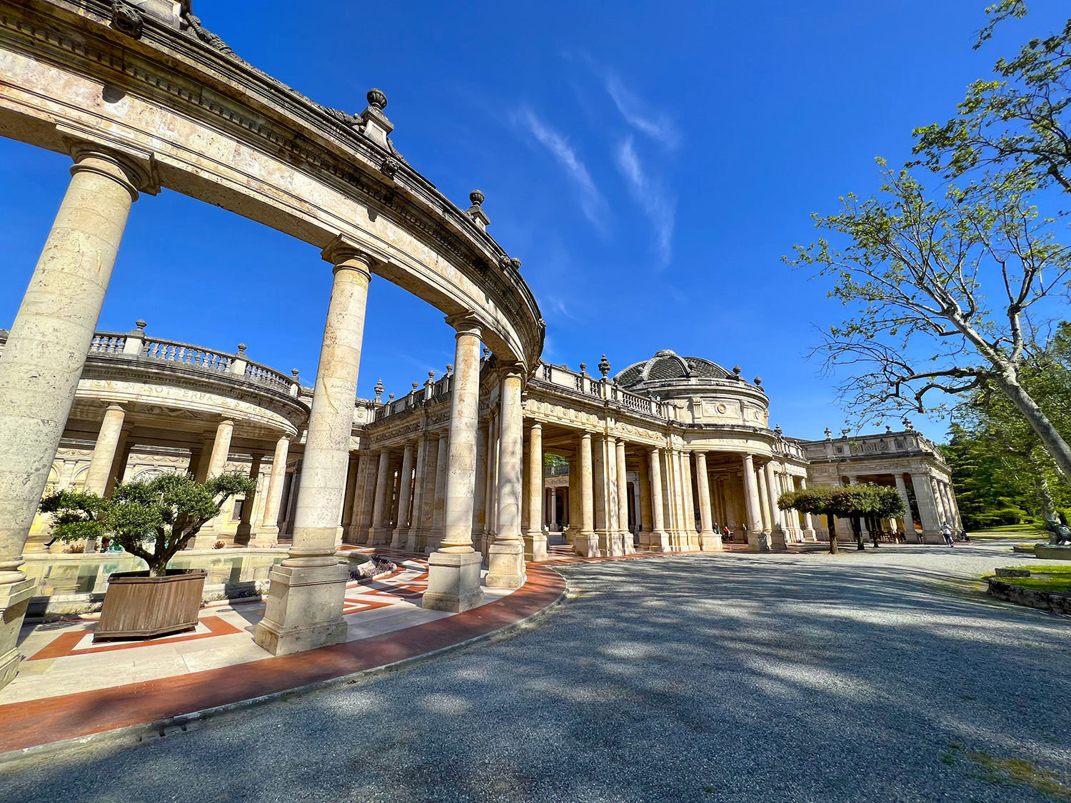 Immerso in un parco ricchissimo di specie arboree, lo stabilimento è costituito da edifici uniti da colonnati che coprono una superficie di ben 10.000 metri quadri tanto da fargli avvalere l’epiteto di “terme dalle cento colonne”. Ma andiamo a scoprirlo…