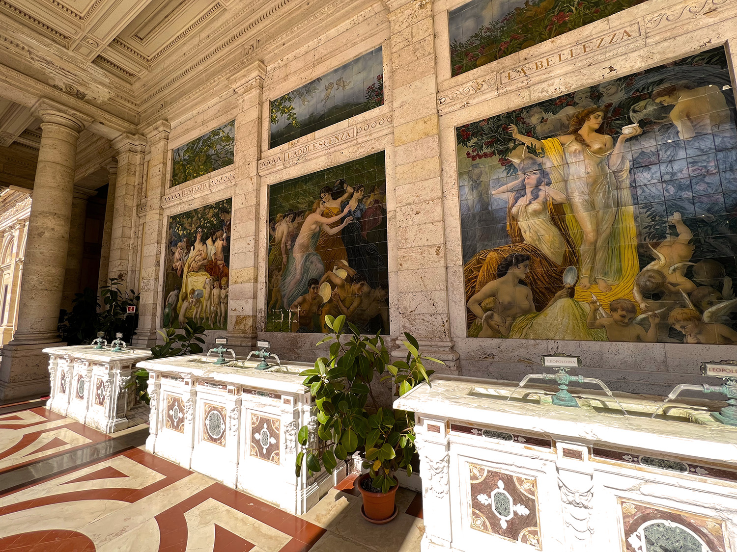 La Galleria delle Bibite o della Mescita è così detta per la presenza dei banchi dai quali venivano servite le acque per la cura. Questi banchi sono realizzati con marmi policromi intarsiati e presentano in rilievo maschere grottesche che rendono ogni elemento una singolare opera d'arte. Sovrastano i banchi sette grandi pannelli con maioliche, opera del raffinato maestro pescarese Basilio Cascella (1860-1950). Essi raffigurano le fasi della vita (Infanzia, Adolescenza, Maturità, Vecchiaia) abbinate a figure allegoriche (la Bellezza, la Fonte, la Forza). Al centro dell'ultimo pannello, in basso, è nitidamente riportato il nome dell'autore e l'anno di installazione dell'opera (1927), curiosamente preceduto da un rosso cornetto portafortuna. Nel pannello dell'Adolescenza, sulla mattonella posta nel vertice in basso a sinistra, è riprodotto lo stemma della "Fabbrica Mattonelle Smaltate G.R. Percossi e C. Civita Castellana".